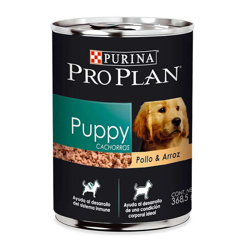 Lata Puppy Pollo-Arroz de la marca Pro Plan es un alimento húmedo para cachorros de todas las razas envasado en lata. El ingrediente principal de su fórmula es la proteína de pollo que favorece el desarrollo de los músculos y fortalece el sistema inmune.